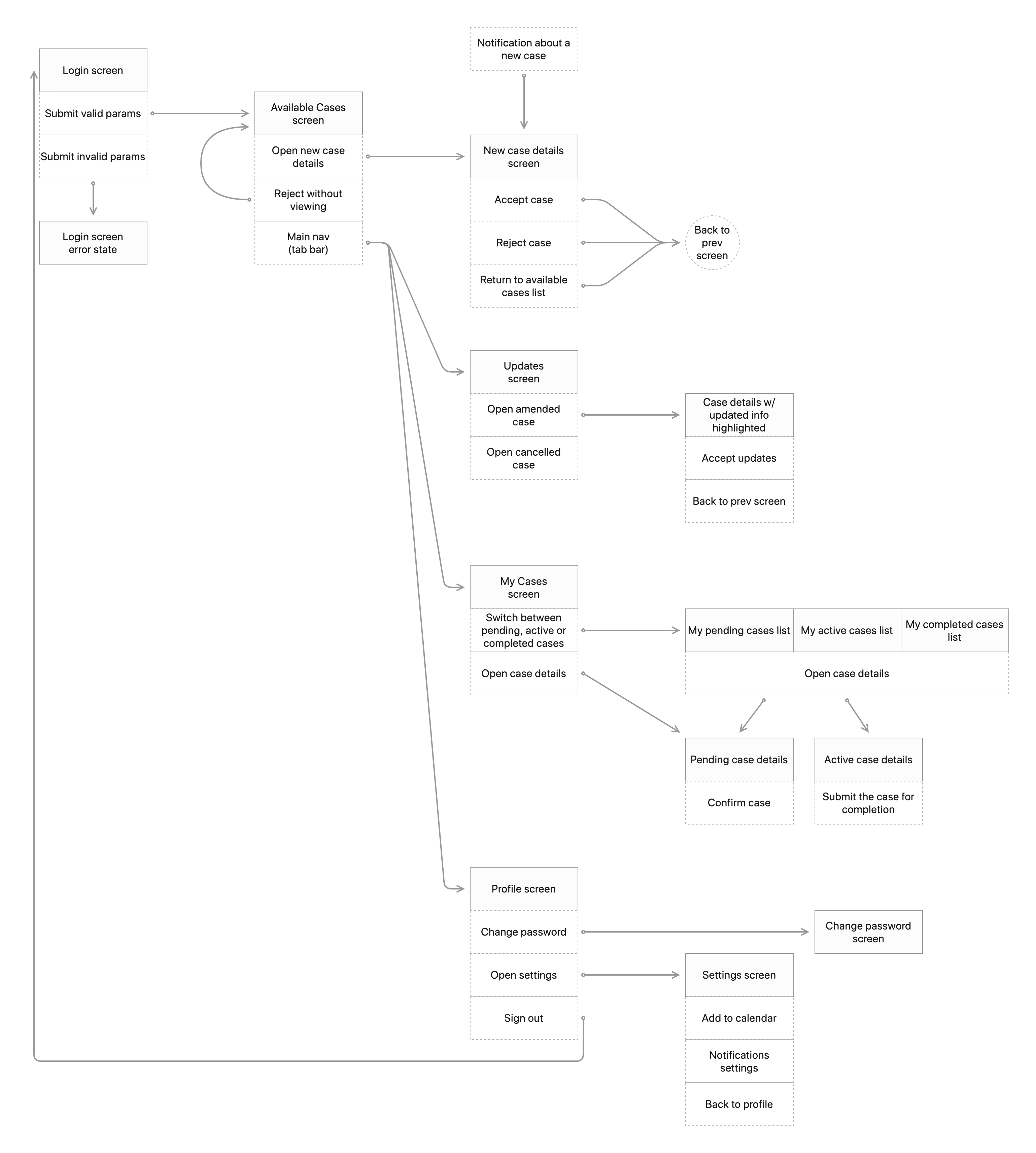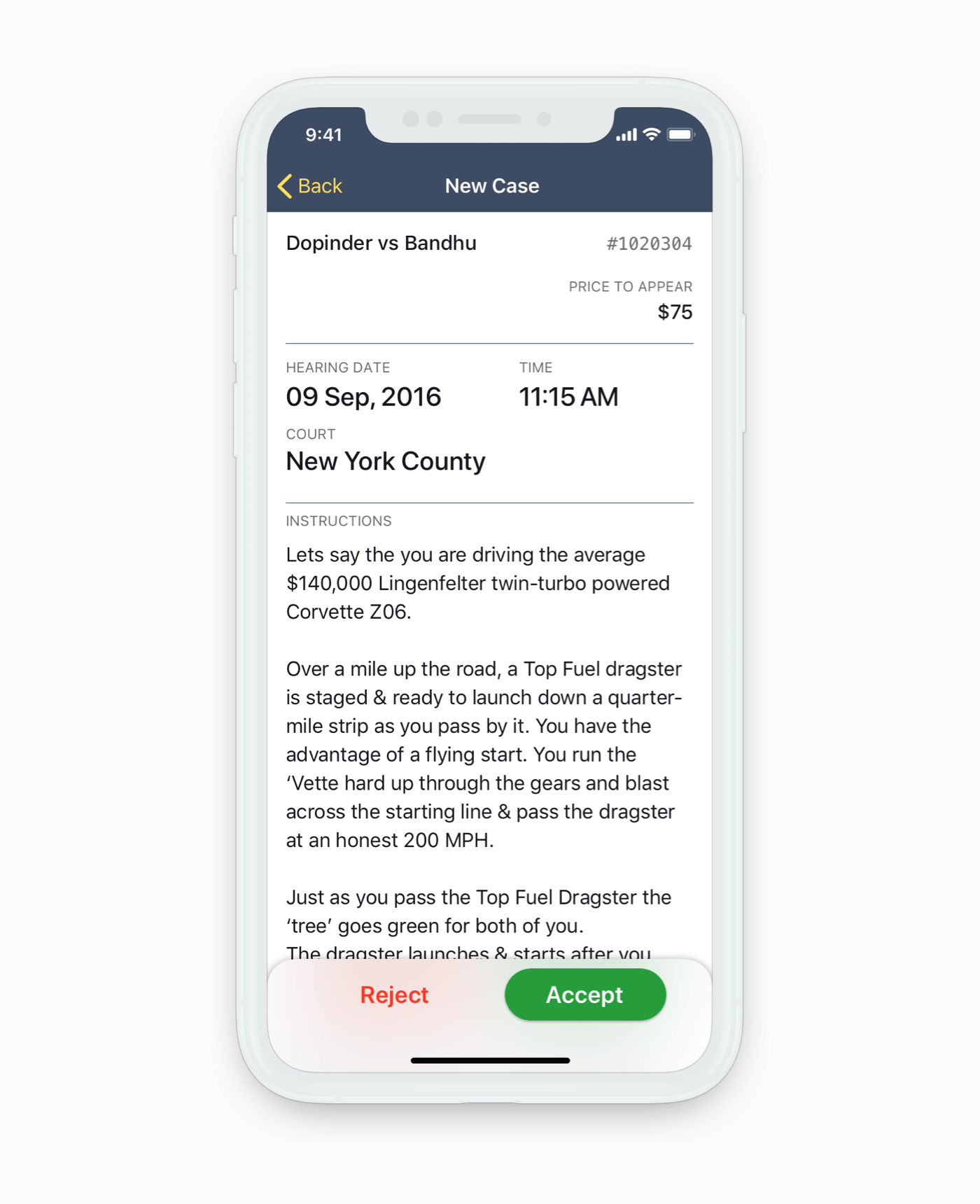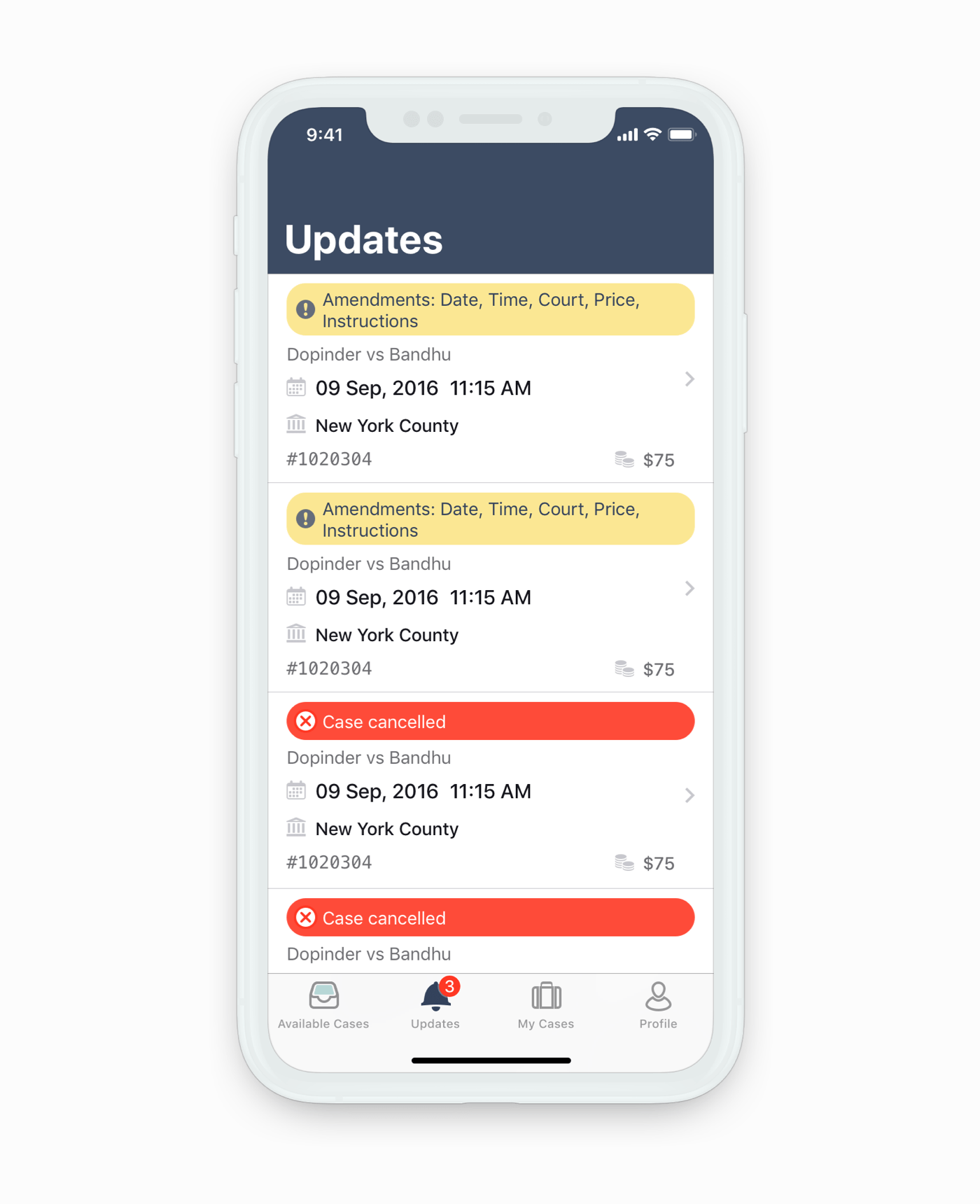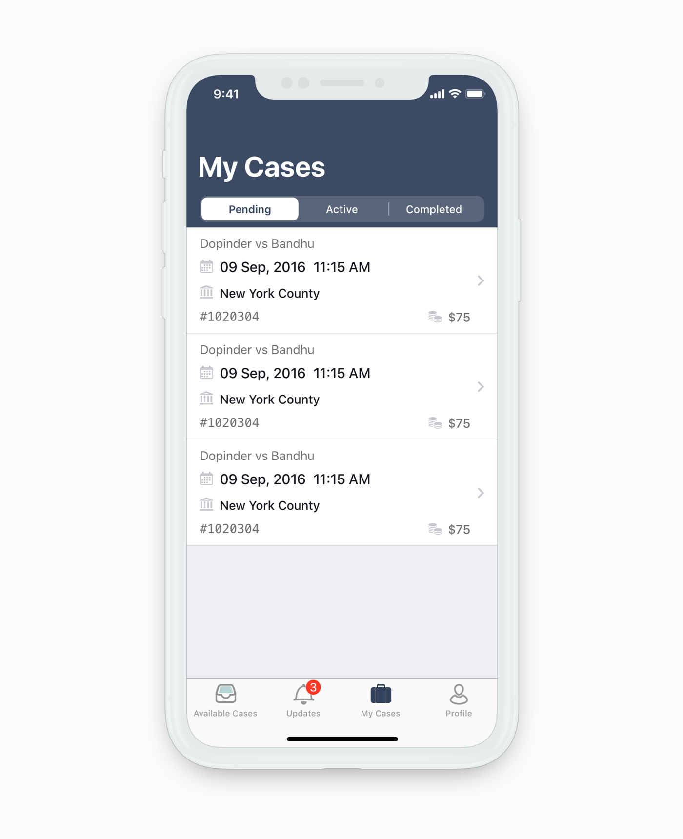The app focuses on a couple of main use cases where an attorney ignores, accepts or rejects an available case and then receives updates on the cases he has accepted. With these use cases in mind I introduced a tabbed navigation.