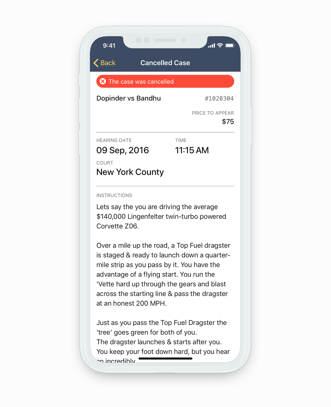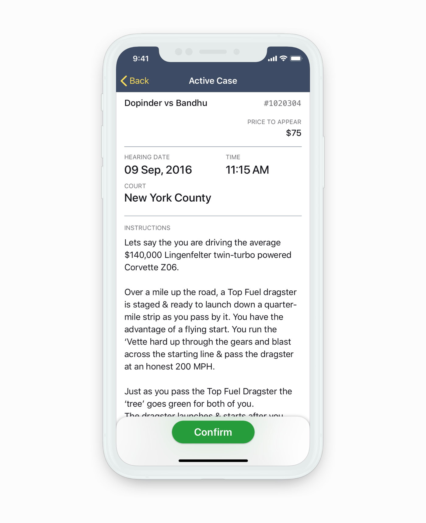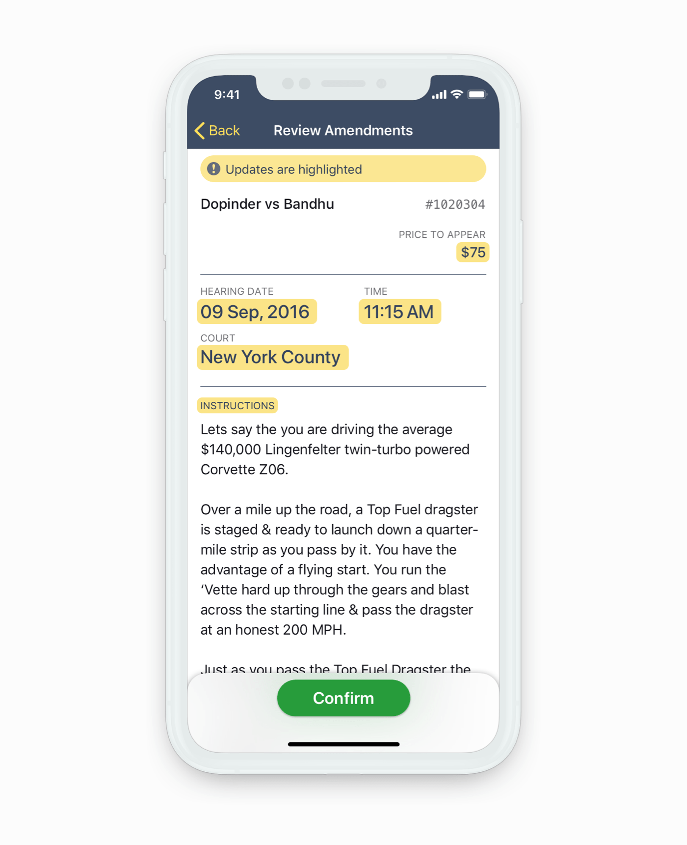 Case details show additional information about a case. Main actions were placed at the bottom for easier reachability. Updates are highlighted until the attorney acknowledges the changes.