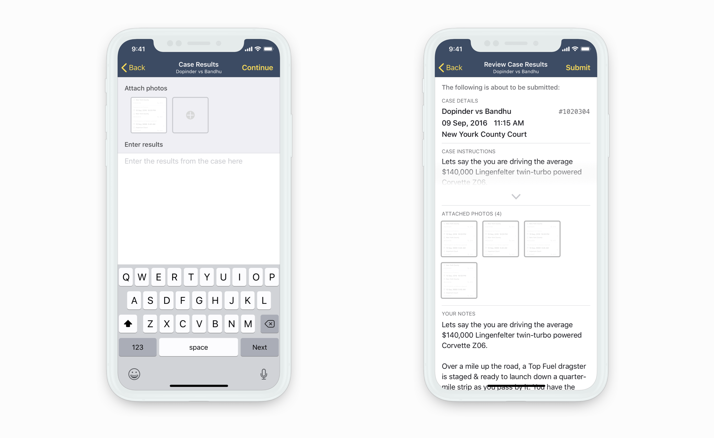 When completing a case, attorneys add notes and attach photos of the relevant documents. To go with the principle of invaluable user input, anything an attorney types or attaches is stored until the case is complete.